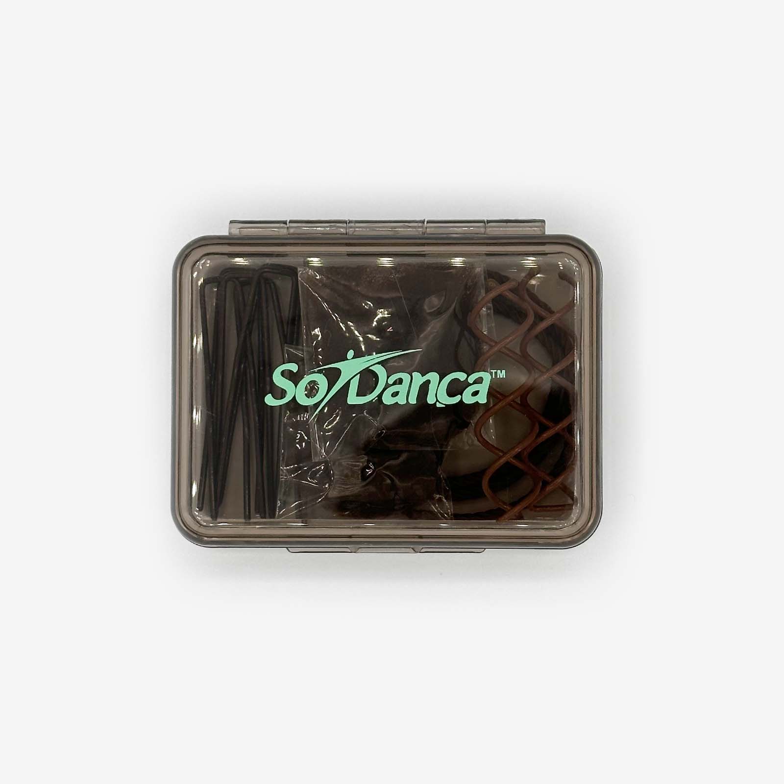 Introducing our travel-size Bun Kit – the perfect solution for on-the-go dancers to make the perfect bun for dance. The compact kit is easy to open and close and has compartments for ouch-less hair ties, large sprung pins, and 2 swirly pins for a super secure bun.