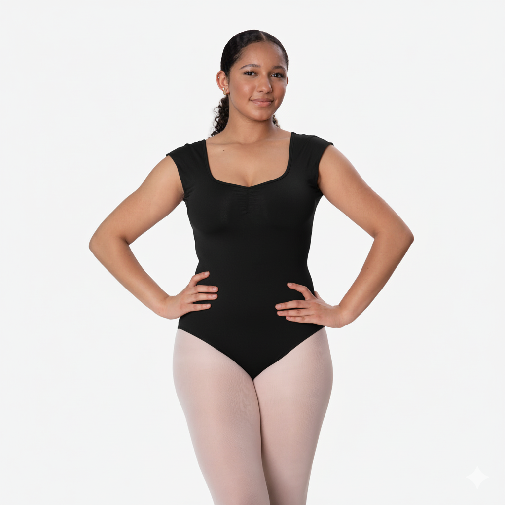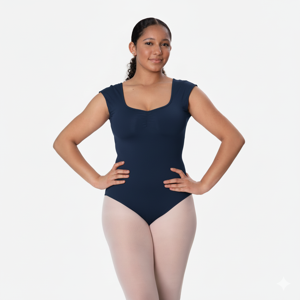 Turn every exit into an encore with the Leyna (D338), the cap-sleeved leotard that’s all about that "wow" factor with its daring deep V-back! Whether you're coming or going, the chic pinched details and silky-smooth fit will have you looking like the star of the studio.
