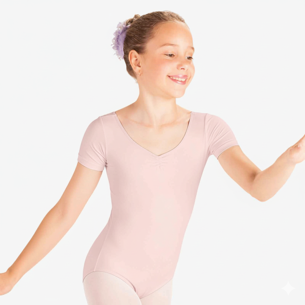 Child microfiber short sleeve leotard with adjustable pinch front and full front lining.