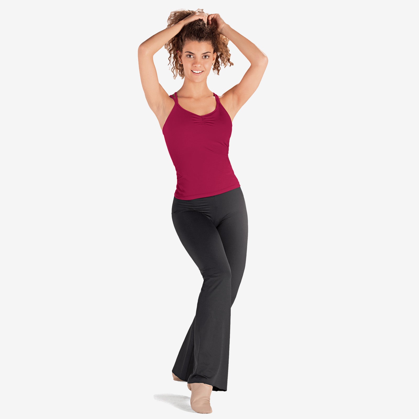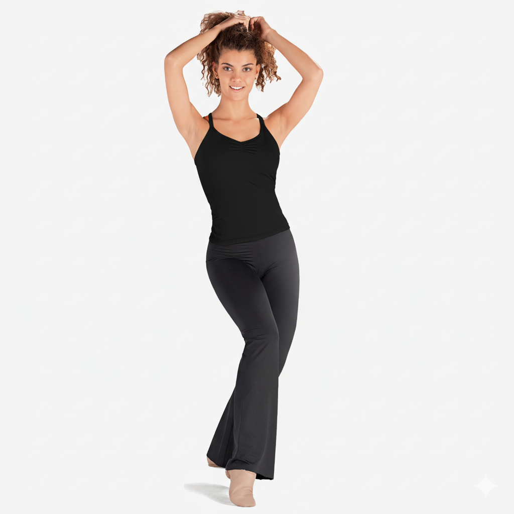Adult camisole top with pinched front, double straps, crossing at the back and shelf lining.