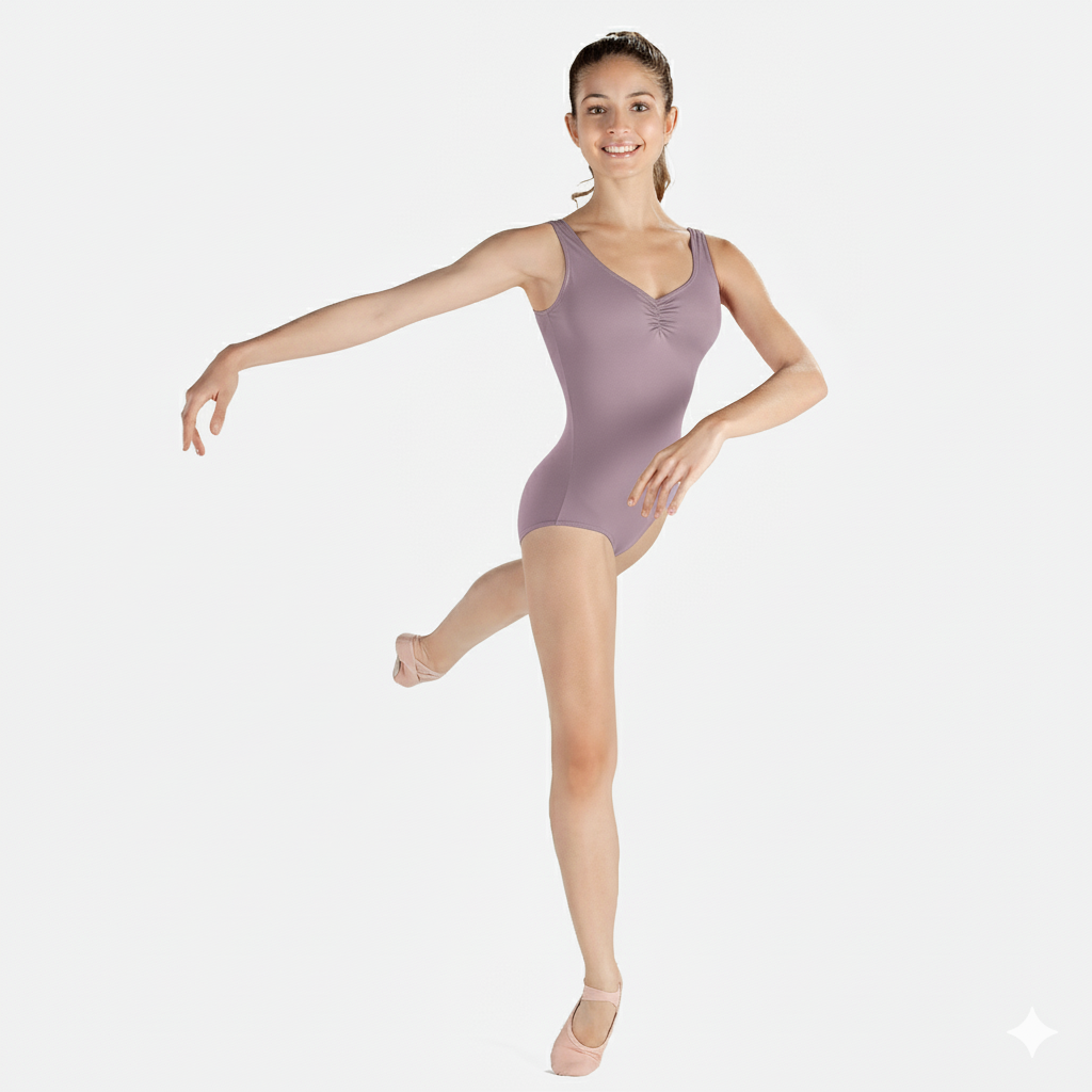 Adult tank cotton leotard with an adjustable pinch front and shelf lining.